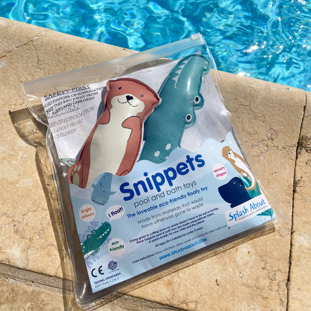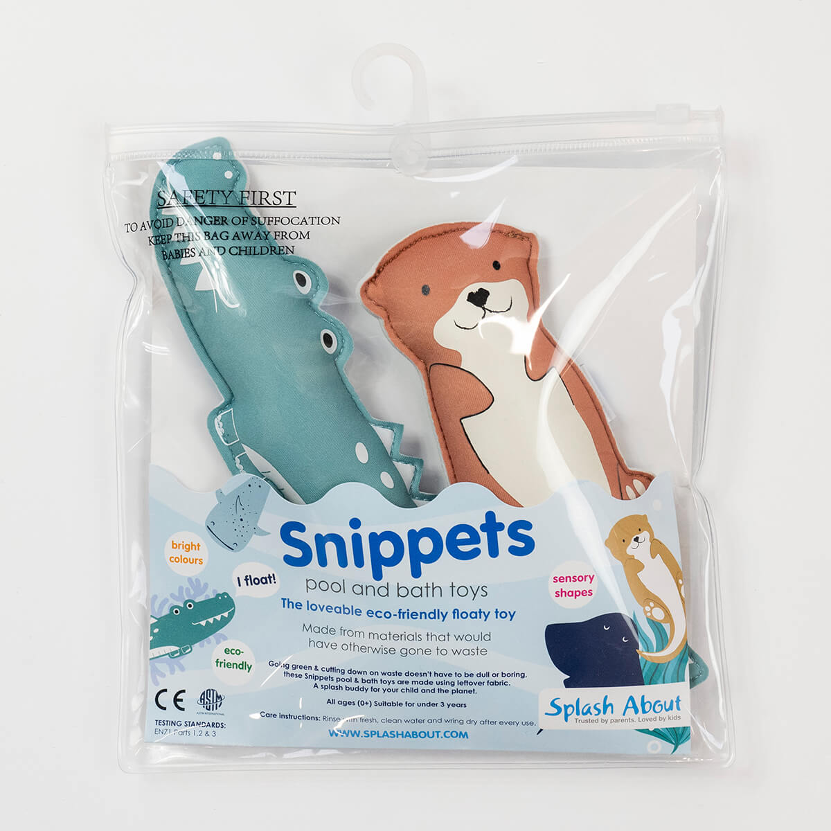 Zabawa: Zestaw 2 przepięknych stworzeń wodnych: wydry i krokodyla. Żywe i jasne kolory sprawiają, że łatwo je dostrzec. Dzięki dwustronnemu nadrukowi zabawki Snippets mają po jednej stronie urocze twarze, a po drugiej zabawny nadruk ze wzorów naszych dziecięcych pianek. Zostały tak zaprojektowane, aby unosić się na powierzchni wody. Te ekologiczne zabawki są małe i miękkie, idealne do chwytania dla małych rączek. Ich lekka konstrukcja jest praktyczna do noszenia w torbach kąpielowych.